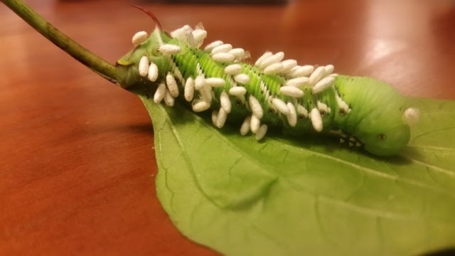 Home just before 10 and out to the deck to water plants. My zephyranthes (rain lilies) are really starting to bloom, but it’s too dark to get a good photo. Found this critter on a jalapeno leaf and brought it inside to get a closeup. I think I’ll call it Sebastian: a parasitized hornworm. All those little white rice-sized bits are wasp eggs, each a dart piercing this poor dude. They’re feeding on the caterpillar. I imagine the larvae swimming through his internal goo to emerge from his eyes or forehead, but I really don’t know the specifics. Nature can be such good, creepy fun.