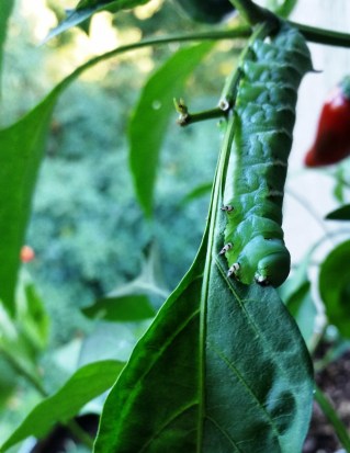 I found one of the jalapeno plants nearly defoliated the other night: here is the munching culprit. I’m amazed that such critters find their way to our second-floor balcony. I watched this eating machine take out half a leaf in the space of a few minutes, chomping at a constant pace, row after row of bites–it made me think of a typewriter, of all things, erasing a page. I couldn’t bring myself to dislodge the glutton with my finger–that single daunting thorny bit on the tail end–and so clipped the branch entire, and dropped it, muncher still munching, or perhaps pausing to consider the sensation of its sudden rushing descent to the lawn below. I wonder if it managed to find cover and food in the scraggly treeline 20 feet behind our building.