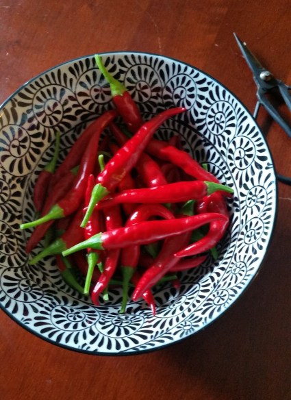 Second harvest from the one cayenne plant on the balcony: it’s already set about a dozen new green peppers since I picked the first batch of 30 in August; I’m hoping for one more flush of bloom and a final crop to set now that I’ve “relieved” the plant of all this seed-setting fruit. We’ll see. But it’s been quite a bountiful reward in return for a simple daily watering. (Cayenne you say hot peppers?)